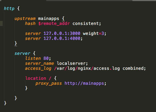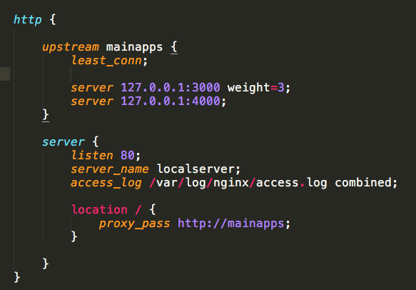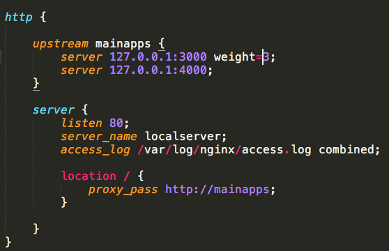 Inside upstream block directive under http directive, we define two server and name of the server. Along with first server definition (127.0.0.1:3000), we also define weight to indicate the server capacity. it means, first server will serve request 3 times higher than other server. this will be useful if we have two different server with different capacity.  in server directive, we use proxy_pass directive to point all traffic to upstream directive.